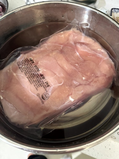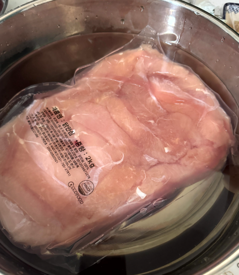 냉동 된 생 닭안심살을 구매했을 경우, 자연해동이나 물에 담궈 해동을 시켜줍니다.